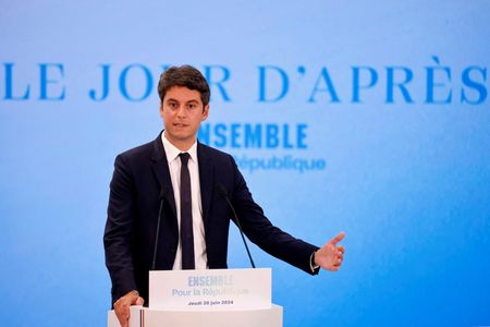 PARIS (Reuters) – French Prime Minister Gabriel Attal on Thursday accused his main challenger for the top job, Jordan Bardella, of tolerating racist speech in the ranks of his far-right camp amid a heated last television debate before the start of parliamentary elections.