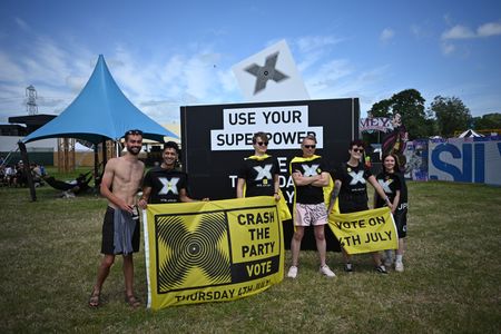 GLASTONBURY, England (Reuters) – Amid the thump of reggae beats from a stage nearby, the leafy scent of cannabis in the air and the warmth of sunshine at Glastonbury, a big sign tells festival-goers to “use your superpower” and vote in Britain’s July 4 election.