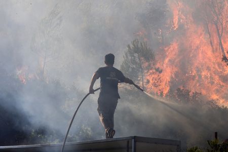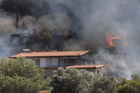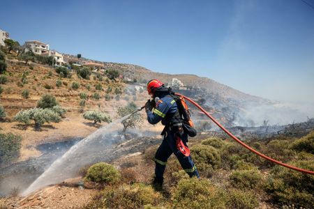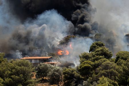 ATHENS (Reuters) -Greek firefighters were battling two wildfires near Athens on Sunday amid strong winds, just hours after managing to contain blazes in a mountainous area also near the capital as well as on an island in the Aegean Sea.