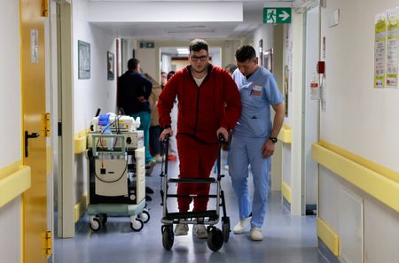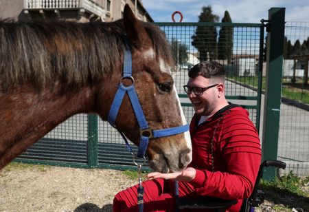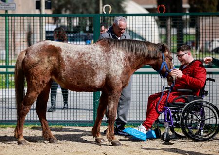 Rome (Reuters) – In an area of Rome that once hosted horse races, four horses and two ponies move at a much slower pace to help neurological patients restore their movements and confidence.