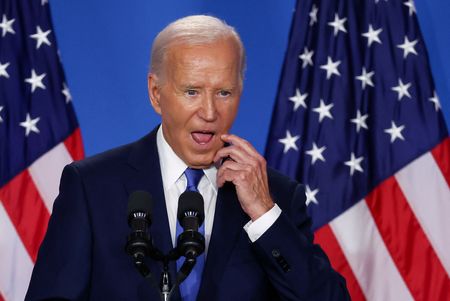 WASHINGTON (Reuters) -President Joe Biden mixed up the names of Vice President Kamala Harris and his Republican rival Donald Trump on Thursday but insisted he was pushing ahead with his re-election bid even as more of his fellow Democrats urged him to end his campaign.