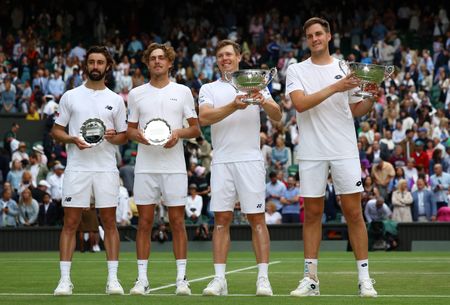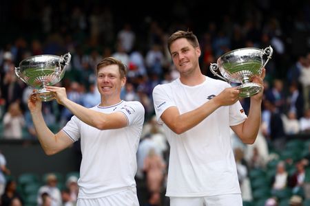 LONDON (Reuters) – Britain’s Henry Patten and Finland’s Harri Heliovaara beat Australians Max Purcell and Jordan Thompson 6-7(7) 7-6(8) 7-6(11-9) in an absorbing men’s doubles final at Wimbledon on Saturday to clinch their first grand slam titles.