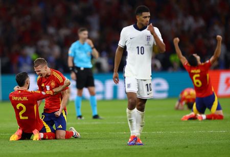 BERLIN (Reuters) – If Marc Guehi’s last-gasp header had hit the net maybe England would have gone on to become European champions on Sunday but instead Dani Olmo cleared off the line and it was Spain who took the glory and handed Gareth Southgate another agonising defeat.