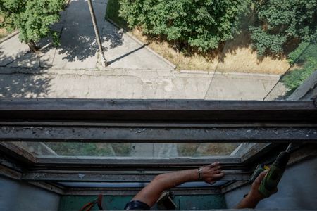 Beibyko’s home, some 50 km (31 miles) from the front line, is one of more than 4,000 whose shattered windows have been replaced with a cheap, polyethylene sheet produced by the group, one of a number of small non-profit groups trying to help.