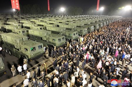 Photographs released by KCNA showed rows of launchers lined up besides red banners that called for victory under floodlights at the event held at night and attended by Kim.