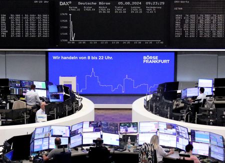 NEW YORK/LONDON (Reuters) -Equities suffered heavy losses around the globe on Monday as Wall Street added to a rout that started in Japan, while the dollar tumbled against the yen and nervous investors looked for signs of a recession in the United States.
