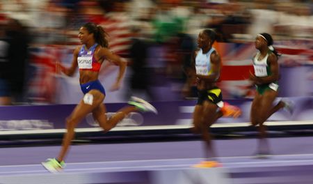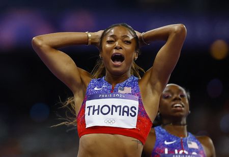 PARIS (Reuters) -American Gabby Thomas finally claimed the global title she has promised for so long when she delivered a dominant performance to take Olympic 200 metres gold on Tuesday, denying silver medallist Julien Alfred a sprint double.