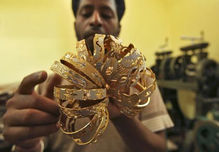 (Reuters) – Gold prices rose to near one-week highs on Thursday, on the back of a weaker U.S. dollar and lower yields after signs of labour market losing steam led investors to expect a super-sized rate cut from the Federal Reserve this month.