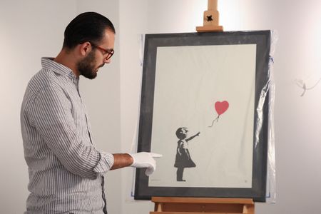 The “Girl with Balloon” first appeared on the streets of London’s Shoreditch neighbourhood in 2002, with Banksy creating versions of the painting on London’s South Bank in 2004 and at Israel’s barrier at the West Bank in 2005.
