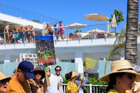 In the Playa de las Americas in Tenerife, protesters appeared on the beach while tourists were sunbathing and chanted “This beach is ours.”