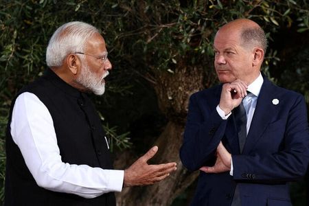 BERLIN (Reuters) -Chancellor Olaf Scholz leads a high-level delegation to New Delhi this week, betting that greater access to the vast Indian market can reduce Germany’s reliance on Beijing even if India does not turn out to be the “new China”.