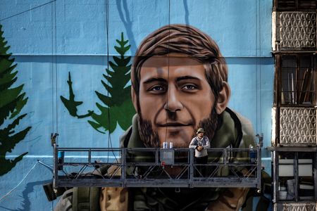 The sweeping mural of the 23-year-old former boxer is one of a dozen around the Ukrainian capital created by artist Eugene Gladenko to commemorate troops killed fighting Russian forces.