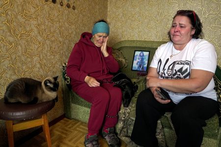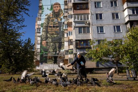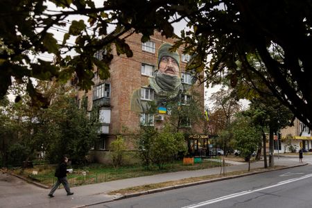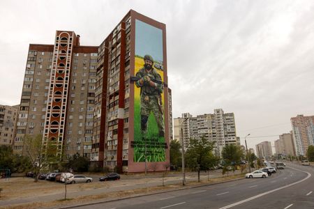 KYIV (Reuters) – Liudmyla Bordus lost her son Maksym to the war with Russia, but he is never far away – his likeness emblazoned in vivid colour across her apartment building in Kyiv.