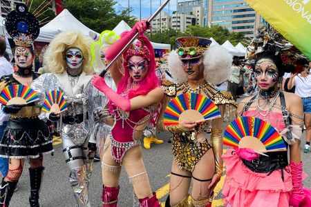 Taiwan’s Nymphia, whose Drag Race win in April electrified the island, appeared wearing an outfit inspired by mediaeval armour with a rainbow flag shoulder cape.
