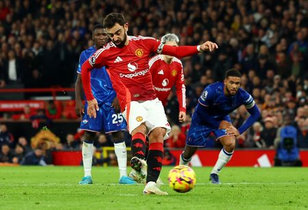 MANCHESTER, England (Reuters) -Moises Caicedo’s blistering second-half strike cancelled out a Bruno Fernandes penalty as Chelsea salvaged a 1-1 draw with Manchester United on Sunday, spoiling United’s celebrations in their first Premier League game since manager Erik ten Hag was sacked.