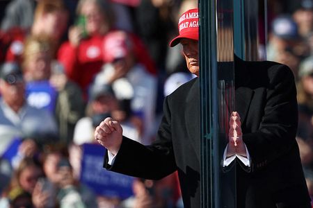 LITITZ, Pennsylvania (Reuters) -Republican Donald Trump complained to supporters on Sunday about gaps in the bullet-proof glass surrounding him as he spoke and mused that an assassin would have to shoot through the news media to get him, adding, “I don’t mind that so much.”