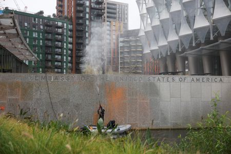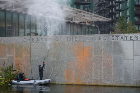 LONDON (Reuters) -British police arrested two men after environmental activists sprayed orange paint on a section of the U.S. embassy building in south London on Wednesday to protest against Donald Trump’s victory in the presidential election.