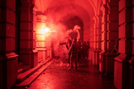 Police used pepper spray to disperse the crowd, after protesters broke windows at the entrance of the 19th-century city hall in the city centre, threw flares and firecrackers inside and spilled liquid manure from a cistern.