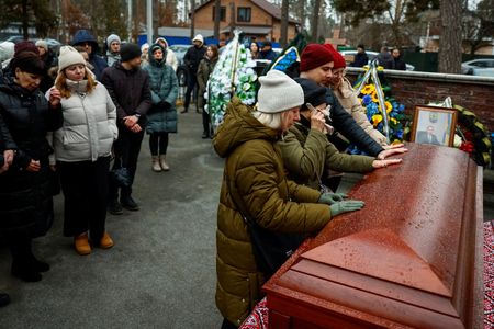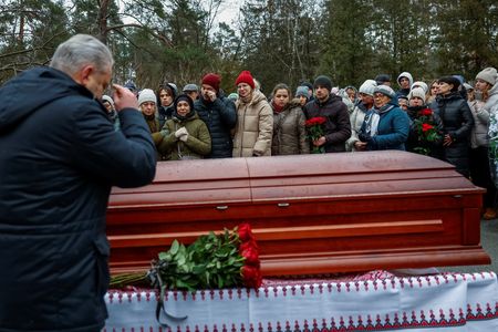 Weeping mourners including Matvieiev’s wife quietly caressed his coffin as a light snow sprinkled down from an overcast sky.