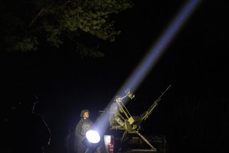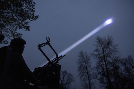 By night, he joins a volunteer force mostly made up of fellow judges, law enforcement officials and other public servants shining searchlights into the sky, trying to spot Russian drones and shoot them down with machine guns.