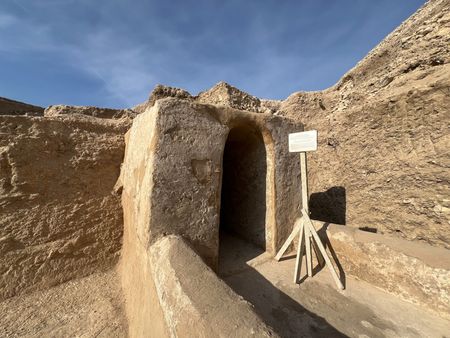 The simple tomb was carved in rock and lay at the end of a mudbrick vaulted chapel with red wall drawings painted on a layer of white mortar.