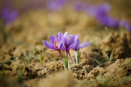 Come October, the crocus plants begin to bloom, covering the fields with bright purple flowers from which strands of fragrant red saffron are picked by hand, to be used in foods such as paella, and in fragrances and cloth dyes.