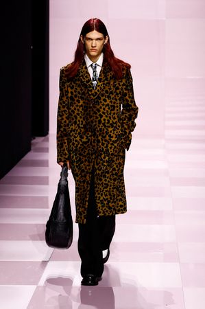 Models strode around the set to marching music, parading chunky wool suits, short bomber jackets, leather bermudas and coats in pastels, autumn tones and psychedelic renditions of the brand’s signature logo patterns.