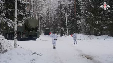 The ministry published video of Yars missile launchers moving through a snowy forest.