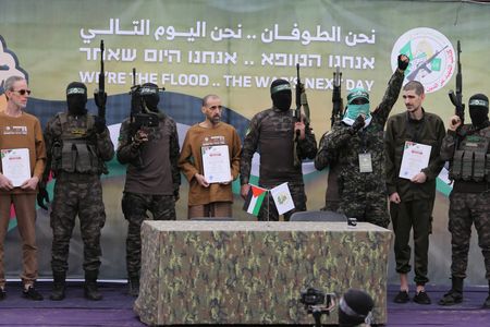 (Reuters) – Hamas handed over on Saturday three Israeli hostages to the Red Cross in central Gaza’s Deir Al-Balah, live television showed.