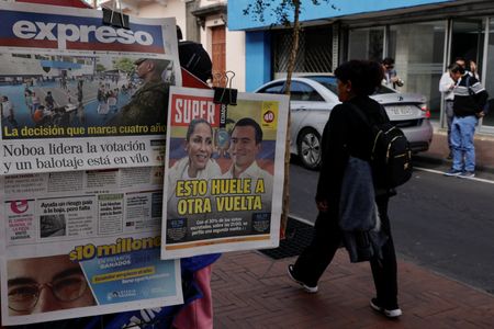 QUITO (Reuters) -An April presidential run-off in Ecuador will pit incumbent Daniel Noboa against leftist Luisa Gonzalez, in an unexpectedly tight contest featuring the same two candidates who were in a 2023 snap election.