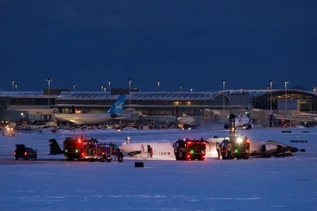 TORONTO (Reuters) -A Delta Air Lines regional jet flipped upside down upon landing at Canada’s Toronto Pearson Airport on Monday amid windy weather following a snowstorm, injuring 18 of the 80 people on board, officials said.