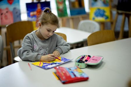 KYIV (Reuters) – As the air raid siren sounded for a ballistic missile threat in Kyiv, dozens of eight-year-old children descended into their primary school’s basement with pencils and textbooks to continue class.