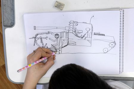 “I tell her, Masha, missiles and bombs are flying, covering her with blankets and pillows,” he said as he drew a tank inspired by stories from his dad, serving in the armed forces.
