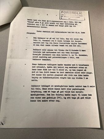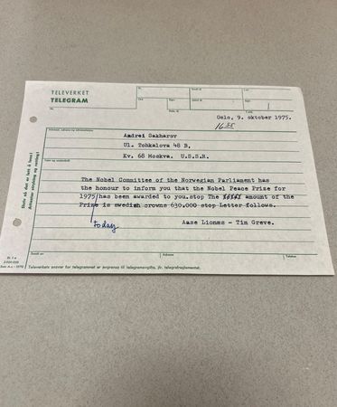 “Sakharov carried with him the typewritten manuscript for his Nobel lecture and his acceptance speech for the award ceremony.”