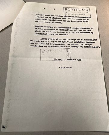 “It was Sakharov, asking whether he could come to the embassy before one o’clock,” Lange wrote in a memo to the foreign ministry back in Oslo.