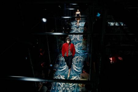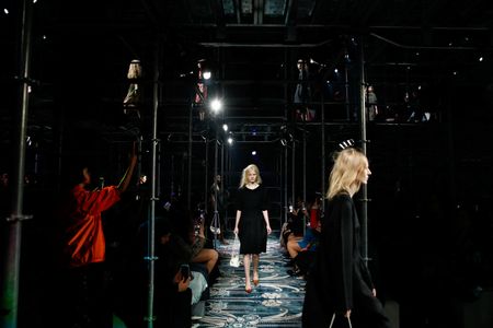 Models walked among metal scaffolds on patterned carpets at Prada’s catwalk show, wearing looses dresses and clothes with raw seams exposed.