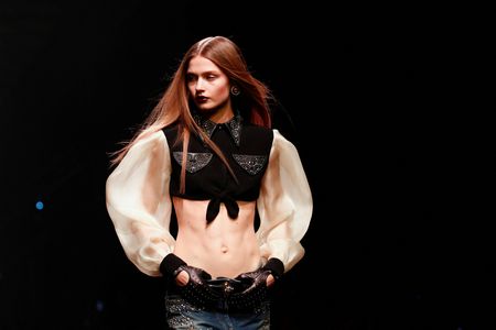Triangular pockets stood out on brightly-coloured jackets, and there were plenty of slinky dresses for the evening. Accessories included studded gloves and caps that added a punky twist.