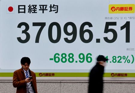 TOKYO (Reuters) – Japan’s Nikkei fell on Tuesday, as markets were jittery about a trade war as fresh U.S. tariffs came into effect, while a stronger yen added to investors’ concerns.