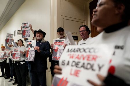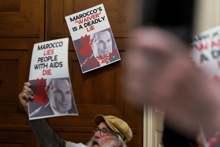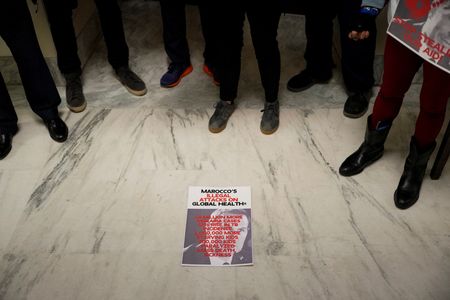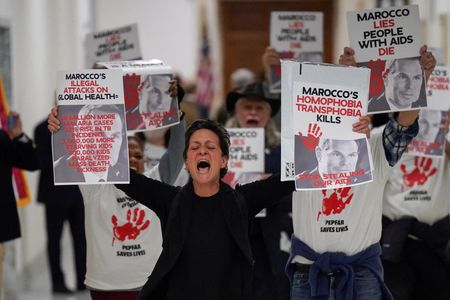 A small group of protesters gathered outside the meeting, calling for aid to be unfrozen and holding signs with slogans including “Marocco lies, people with AIDS die.”