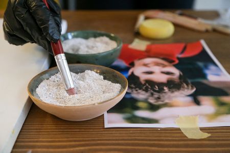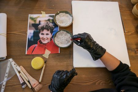 She worked at her table with the canvas laid out in front of her, at times sprinkling the ashes on an adhesive.