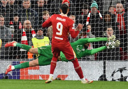 LONDON (Reuters) – Liverpool’s first major setback of the season acted as a sudden jolt to the system of Arne Slot’s team, but they must quickly shrug off the disappointment of their Champions League exit and deliver silverware on Sunday, says goalkeeper Alisson.