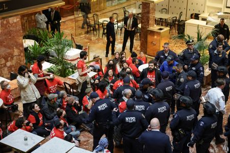 (Reuters) -Scores of people poured into the lobby of Trump Tower in New York City on Thursday to protest the arrest and detention of Columbia University student Mahmoud Khalil, whom the Trump administration aims to deport over his pro-Palestinian activism.