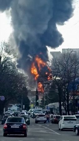 As many as 121 firefighters were battling to put out the flames, Kondratiev said, without saying if the site had been hit by a drone or a missile.
