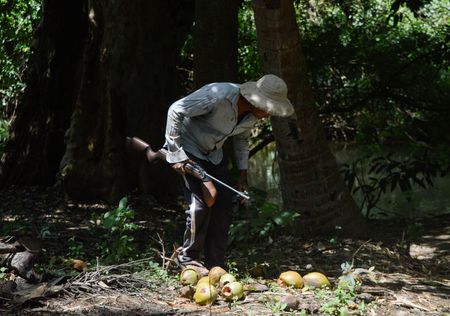 With an air gun across his shoulder and lead pellets in a plastic bag, Gnanasena spends hours patrolling the neat rows of coconut, mango and banana plants he has carefully grown.