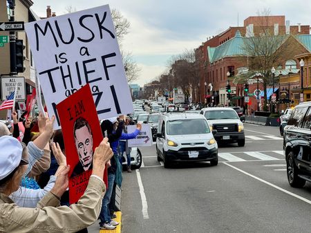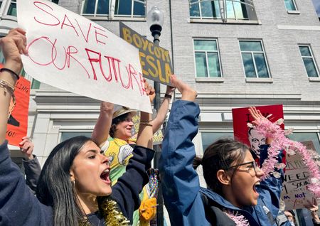 WASHINGTON (Reuters) – Roughly 100 people waved signs and danced in protest outside a Tesla dealership in Washington on Saturday, angry at the electric vehicle maker’s billionaire CEO Elon Musk, who has led efforts to sharply cut the federal workforce.