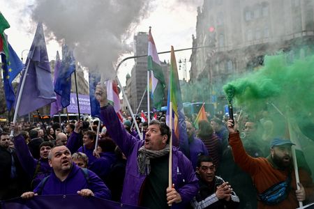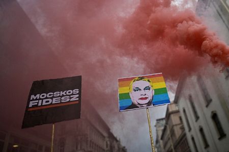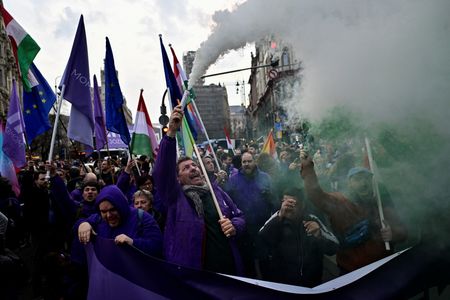 BUDAPEST (Reuters) – Thousands of people protested in Budapest on Tuesday against a new law that aims to ban the annual Pride march by LGBTQ+ communities and allows the use of facial recognition software to identify organizers and attendees.