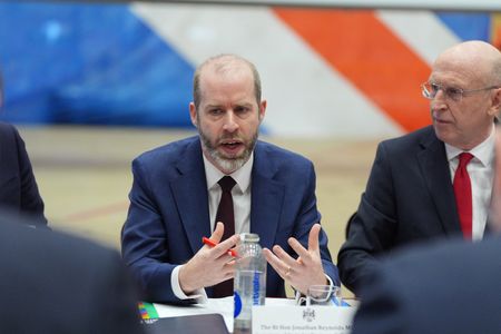 LONDON (Reuters) -British business and trade minister Jonathan Reynolds was interrupted by two pro-Palestinian protesters opposing arms sales to Israel who stormed the stage as he was about to speak at a think-tank event on trade on Thursday.