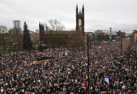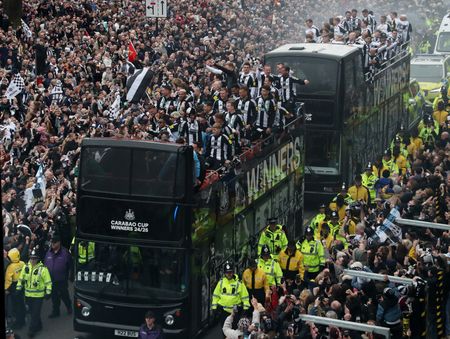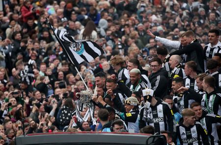 NEWCASTLE, England (Reuters) – Tens of thousands of Newcastle United fans gathered in the city on Saturday to celebrate the club’s first domestic trophy in 70 years, with the streets turning a sea of black and white for the open-top bus parade.