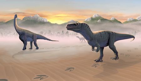 The ones that made the Isle of Skye tracks were part of a family called megalosaurs. One possibility is Megalosaurus, which lived about 100 million years before its distant relative Tyrannosaurus, measured about 20 feet (6 meters) long, walked on two legs and had a mouthful of large serrated teeth.