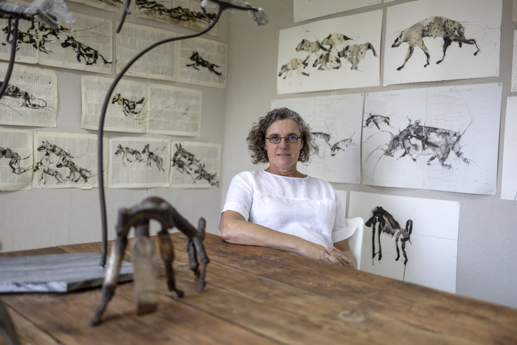 “They have been Disney-fied, made into creatures they are not.”Coetzee, 53, identifies in the animal a “celebration of the matriarch” in packs that are led by an authoritarian female and where other females dominate, for example in the sharing of food.She has spent hours observing the creatures in South Africa’s Kruger National Park, noting the “pseudo-phallus” genitalia of the females that to an average tourist gives them the appearance of males.”I would sketch with windows open so I could smell them,” said the artist, who also has a science degree. “I had rooibos tea in the car so I used that,” she said.